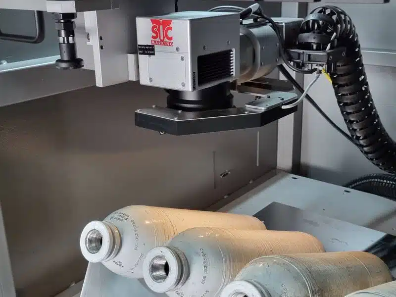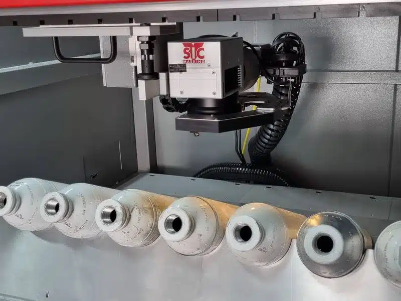 Los cilindros de gas requieren pruebas periódicas cada 10 años. Tras superar la prueba, el cilindro debe ser remarcado con diversa información, incluida la fecha de la próxima inspección. Nuestras máquinas de marcado láser son ideales para marcar una amplia gama de cilindros de diferentes tamaños.