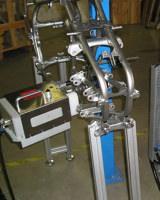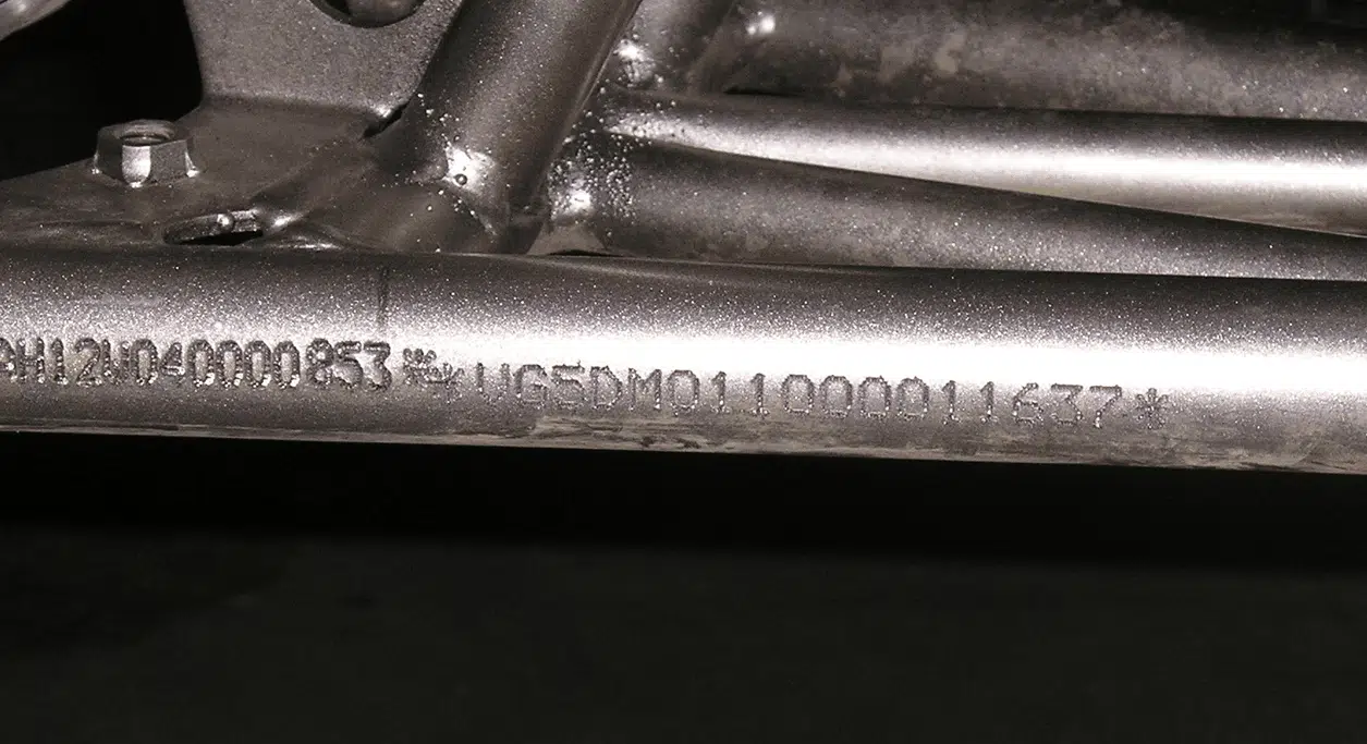 Una aplicación clásica a primera vista, ya que se trata de marcar un número de chasis VIN en bastidores de motos, scooters y cuatrimotos.