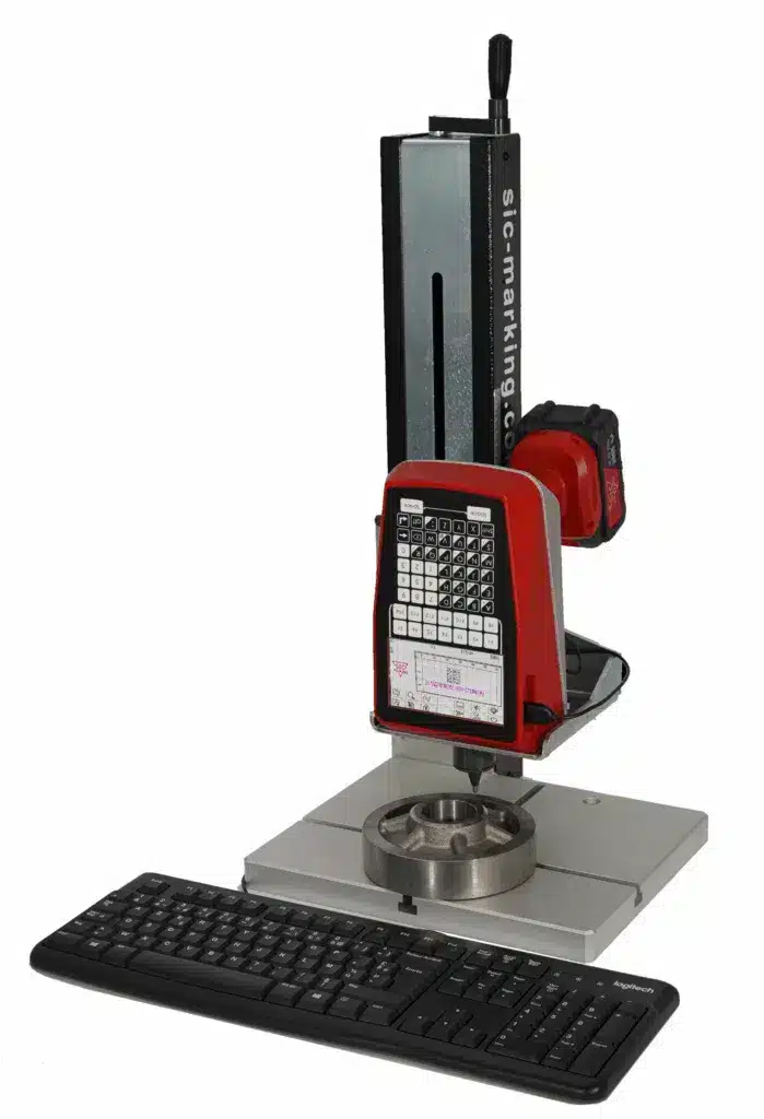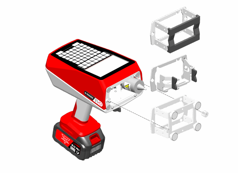 La E‑MARK EVO es una máquina portátil de marcado por micropercusión, inalámbrica y todo en uno, capaz de marcar todo tipo de materiales, desde plástico hasta acero tratado, hasta 62 HRC.