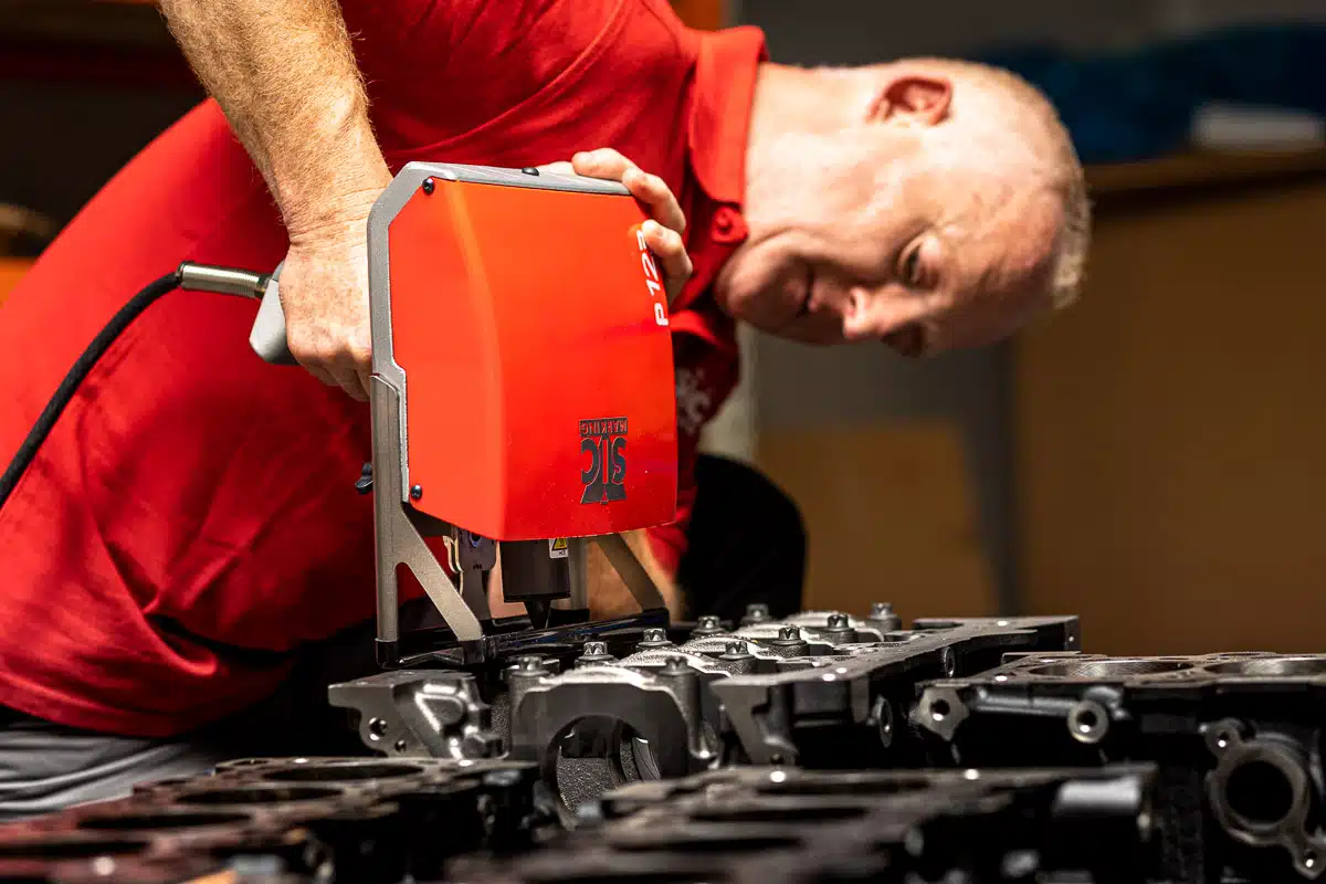 Esta máquina de marcado nómade está adaptada a la IDENTIFICACIÓN Y TRAZABILIDAD DE PIEZAS PESADAS Y VOLUMINOSAS y puede marcar todo tipo de materiales.